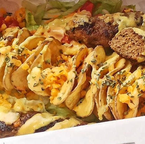 Un espiral de papa crujiente acompaƱado de 2 dedos de carne, 3 vegetales, 1 tipo de queso, 3 salsas, 1 topping.